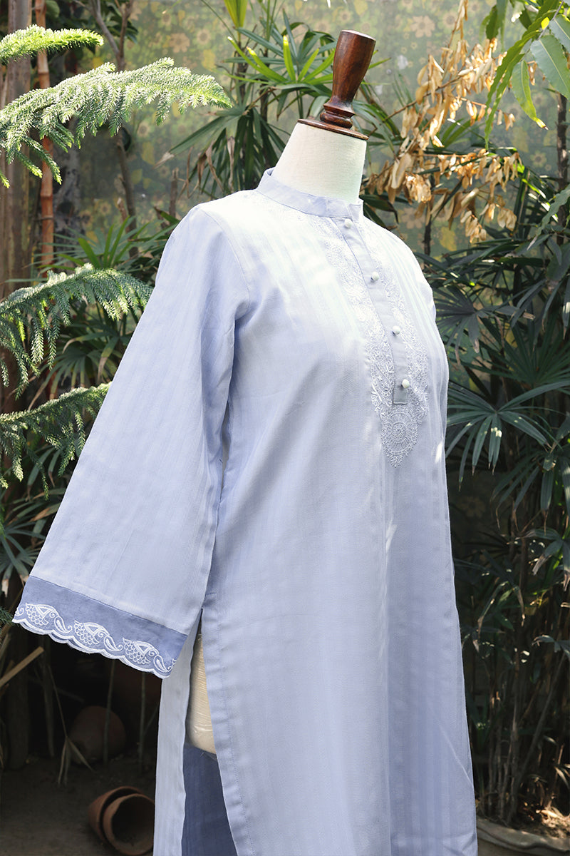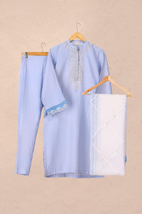 A trendy design is portrayed on this chic ensemble, rendered in an appealing sky shade. It features a graceful shirt adorned with meet open ban neck and placket having exquisite embroidery. Paired with a matching trouser, this graceful outfit showcases an enduring color palette featuring ornamental embroideries that offer the right balance between style and practicality.